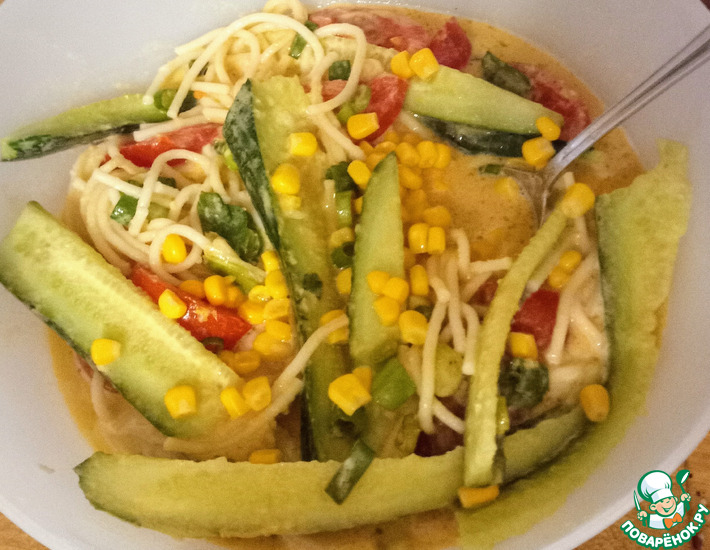 Тем временем отварить лапшу в соответствии с инструкциями. Наконец, в салатнице смешать маринованный зелёный лук, помидоры, огурцы, 1/3 банки кукурузы и отваренную лапшу. Полить соусом. Можно подавать. Приятного аппетита.